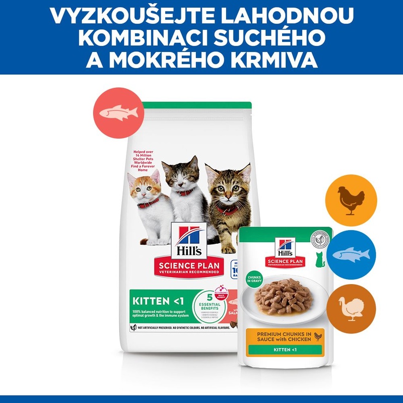 Kompletní krmivo Hill's Science Plan Kitten s lososem podporuje optimální růst a funkci imunitního systému koťat. Obsahuje DHA z rybího oleje pro zdravý vývoj mozku a očí, bílkoviny pro tvorbu svalové hmoty, vyvážený poměr minerálních látek pro zdraví kostí a zubů a speciální směs prebiotik ActivBiome+ Multi-Benefit pro výživu střevního mikrobiomu. Granule jsou přizpůsobené jedinečným potřebám koťat tak, aby jim zajistila co nejlepší start do života a umožnila jim plně rozvinout jejich potenciál.