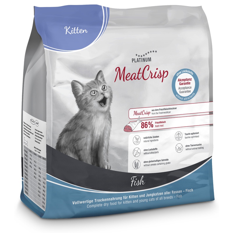 Kompletní suché krmivo Platinum MeatCrisp pro koťata a dospívající kočky obsahuje 86 % čerstvého rybího masa – lososa – připravovaného unikátní metodou Freshmeatdryer, při níž se do sušičky, kde při nízké teplotě cirkuluje vzduch, vloží čerstvé maso s dalšími přísadami. Pomalé a rovnoměrné sušení zachovává přirozenou chuť masa i důležité živiny. Proto jsou granule MeatCrisp zdravé, křupavé, plné chuti a neodolá jim ani ten nejmlsnější kočičí jazýček.