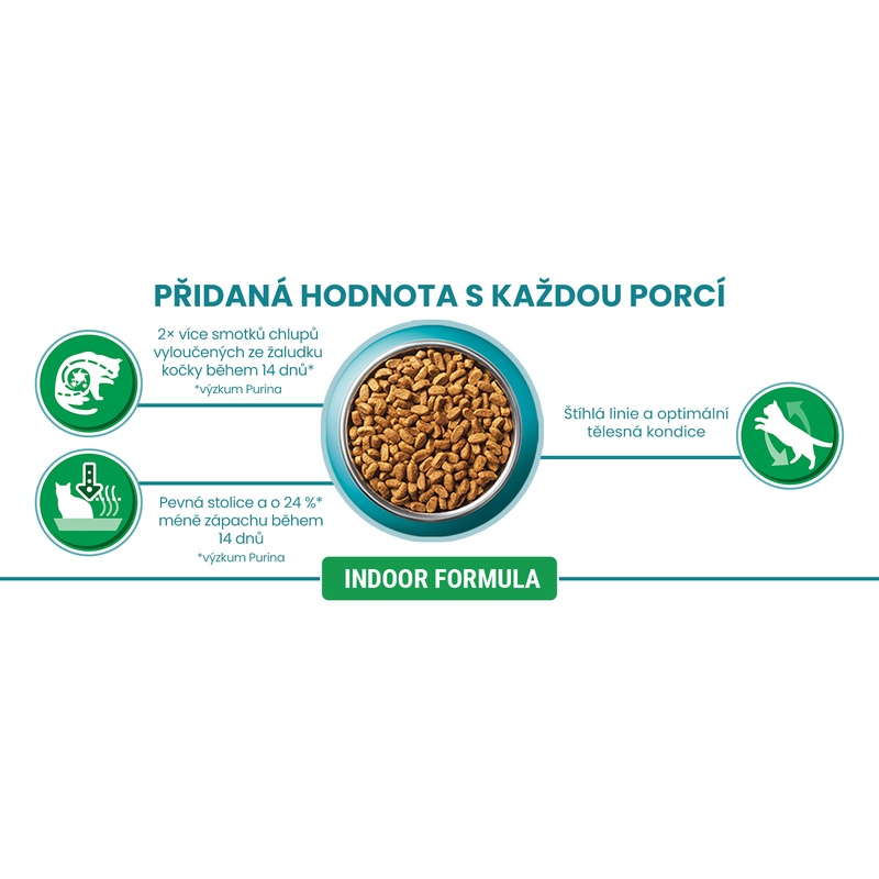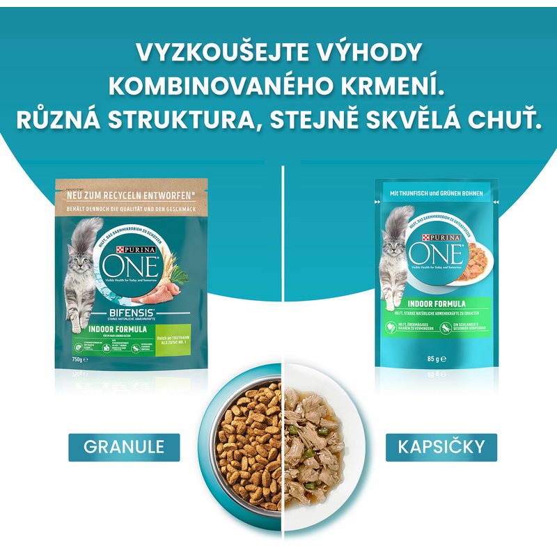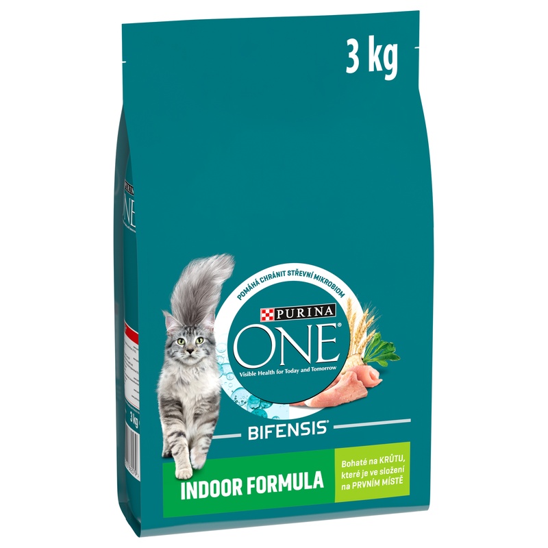 Purina ONE Bifensis Indoor Formula je receptura s krůtou pro kočky žijící převážně v bytě, vhodná pro minimalizaci tvorby smotků chlupů (trichobezoárů) v zažívacím traktu. Pro zdraví koček, které tráví většinu času v interiéru, je nezbytný také vyvážený střevní mikrobiom, krmivo proto obsahuje laktobacily – prospěšné bakterie, u nichž je vědecky prokázáno, že posilují imunitní systém kočky a pomáhají chránit střevní mikroflóru. Granule dále obsahují prebiotika z čekanky, které vyživují prospěšné bakterie ve střevech. Krmivo tak pomáhá udržet kočku zdravou po všech stránkách – od zažívání přes imunitní systém až po lesklou srst.