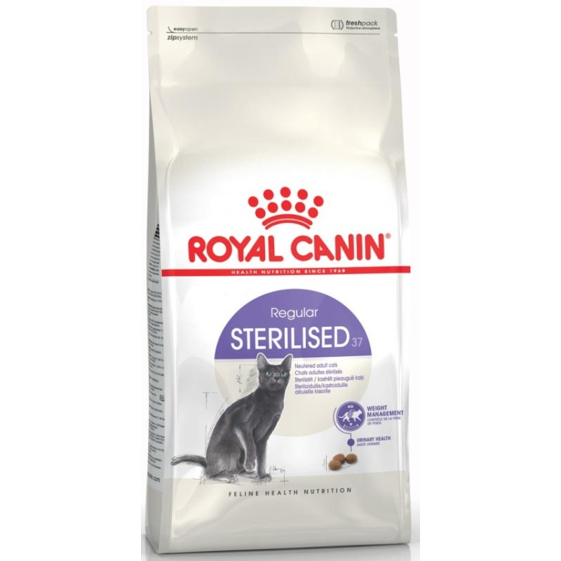 Royal Canin Sterilized 37 je kompletní krmivo se středně vysokým obsahem tuku vhodné pro dospělé kastrované kočky ve věku 1–7 let. Jsou-li granule podávány v adekvátních denních dávkách, pomáhají kočkám po sterilizaci udržet optimální tělesnou hmotnost. Vyvážené spektrum minerálů podporuje zdraví močového systému a zvýšený obsah bílkovin přispívá k udržení svalové hmoty.
