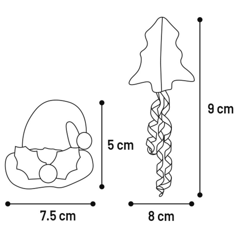Vánoční hračky pro kočky ve tvaru čepice s bambulkou a stromečku se stužkami jsou vyrobeny z různých druhů tkanin (plátno, plyš atd.). Uvnitř hraček je catnip (šanta kočičí), jehož vůně povzbuzuje ke hře až 70 % koček.