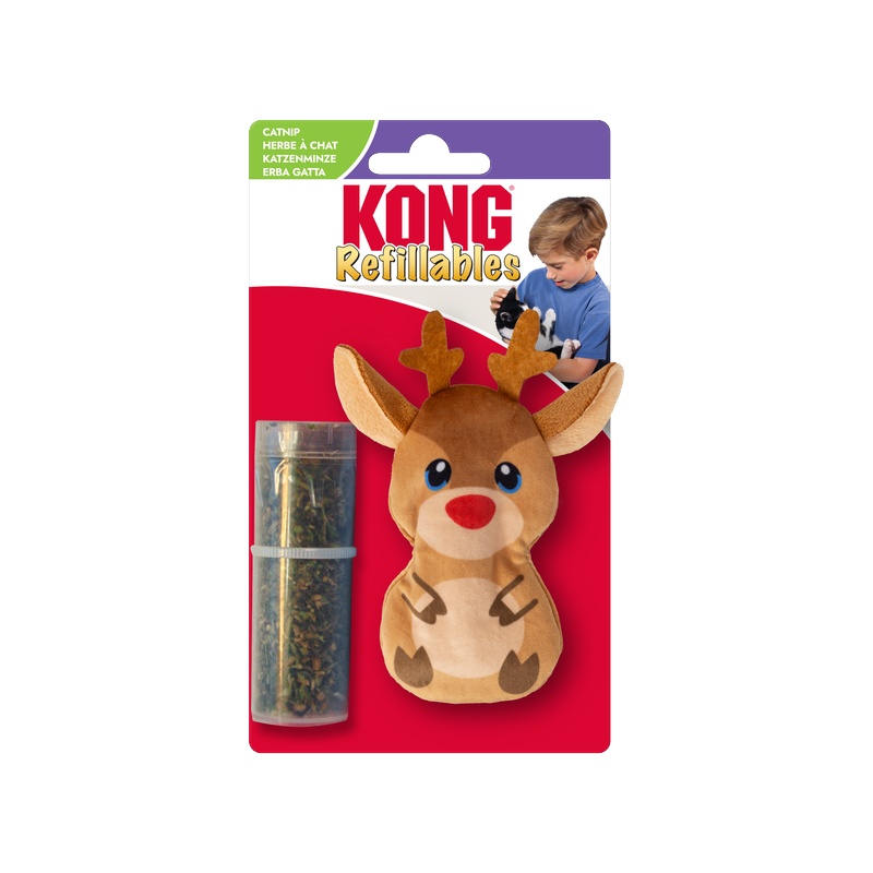 Roztomilý plyšový sobík z řady KONG Holiday Refillables probudí ve vaší kočce přirozené lovecké instinkty a zažene nudu nejen o Vánocích. Sob má uzavíratelnou kapsu na suchý zip, kterou můžete opakovaně plnit přiloženým catnipem (šantou kočičí), přírodní nenávykovou bylinou, jejíž vůně přitahuje až 70 % koček.
