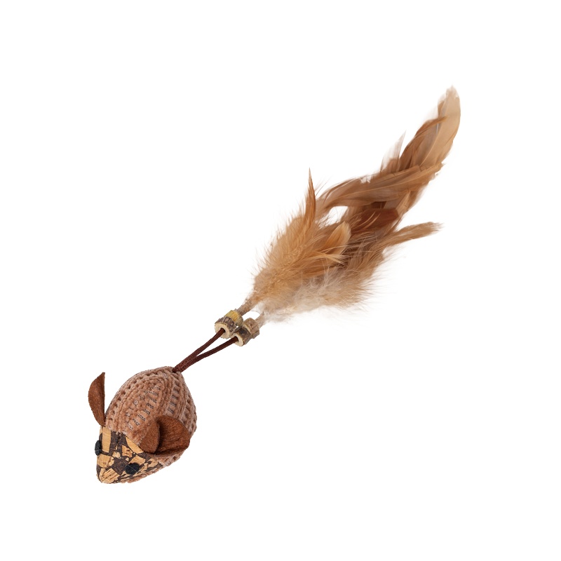Hračka ve tvaru myšky je vyrobená z měkkého úpletu, korku a juty. Pro větší vzrušení ze hry je doplněná peříčky připevněnými na provázcích. Různorodé textury a přírodní materiály stimulují přirozené lovecké instinkty kočky a podněcují ji k aktivní hře. Hračka je vhodná pro kočky všech věkových kategorií.