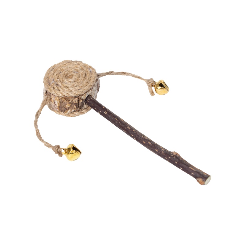 Hračka připomínající indický bubínek je vyrobená ze dřeva a sisalového provázku, na kterém jsou připevněné dvě rolničky. Díky různorodým texturám a zvuku rolniček hračka stimuluje lovecké instinkty kočky a pomáhá zahánět stres a nudu. Je vhodná pro kočky všech věkových kategorií.
