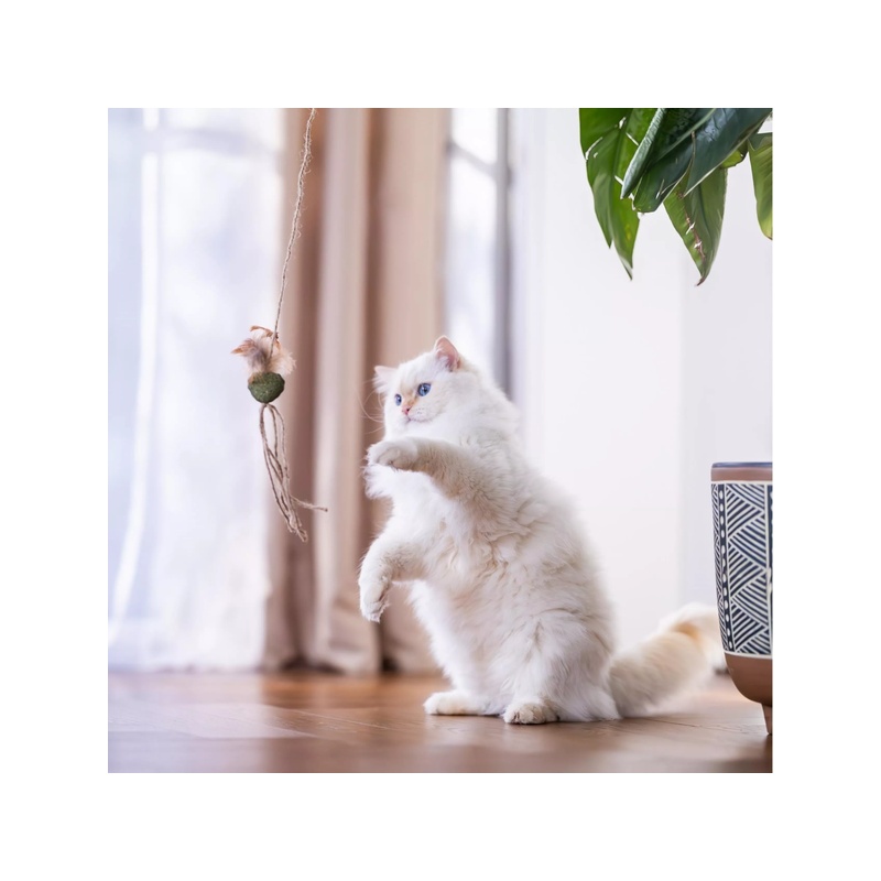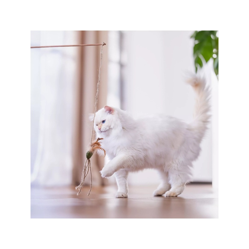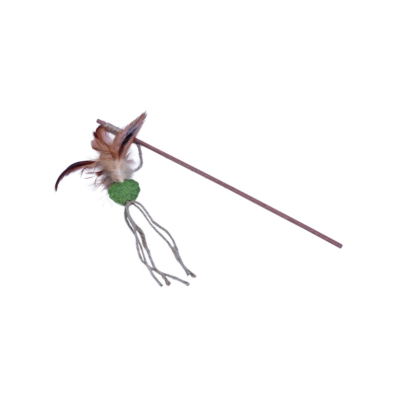Vábnička s rukojetí z odolného dřeva sapeli má závěs s peříčky, srdíčkem z lisované šanty kočičí (catnipu) a provázkovými třásněmi. Hračka stimuluje lovecké instinkty a posiluje pouto mezi vámi a vaší kočkou při společné, interaktivní hře. Je vyrobena z bezpečných přírodních materiálů a vhodná pro kočky všech věkových kategorií.