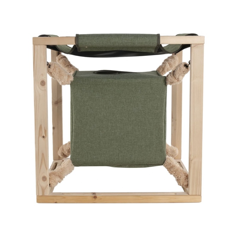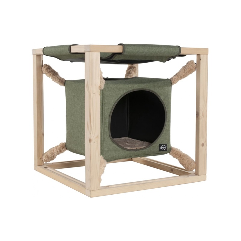 Odpočívadlo Quapas! Catcube je vhodné pro kočky, které milují pohodlí a nerady spí na zemi. Kočka má na výběr mezi chráněným místem ve visutém domku a hamakou v horní části odpočívadla. Hamaka je připevněna pomocí suchého zipu, takže se dá snadno sundat a vysát vysavačem nebo očistit vlhkým hadříkem. Domek má široký kruhový vstup a je vybaven plyšovou podložkou, kterou lze vyjmout a vyprat. Na stabilní konstrukci z masivního dřeva si kočka může brousit drápky – pokud jí to dovolíte.