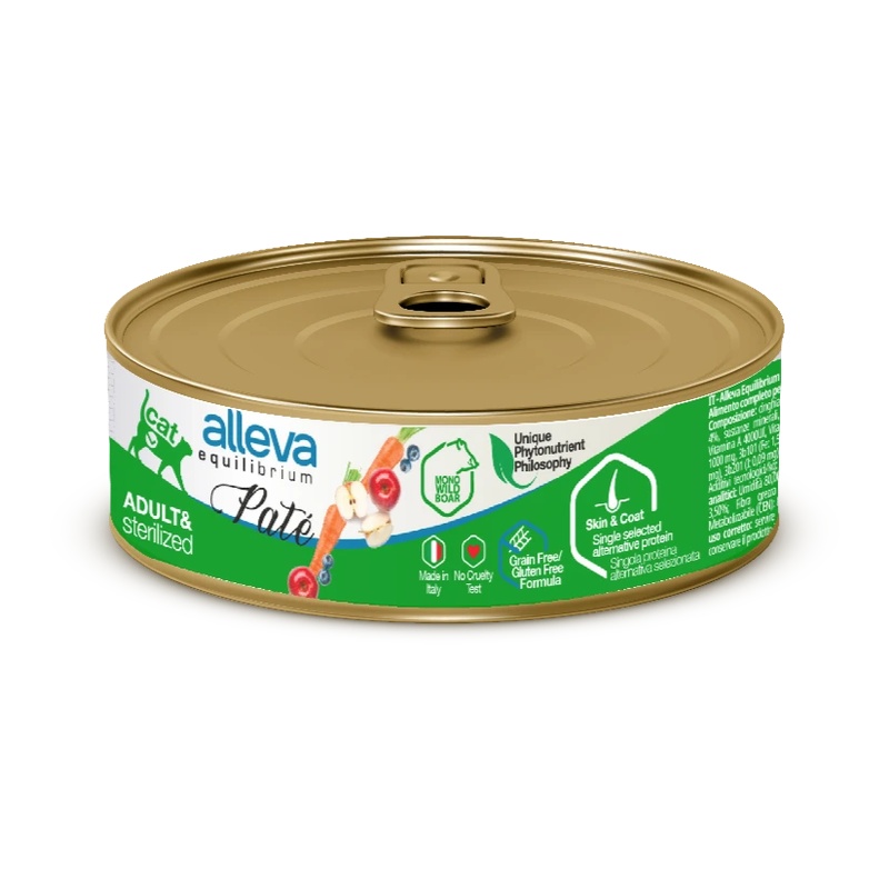 Alleva Equilibrium Boar Paté je vysoce kvalitní kompletní mokré krmivo pro zajištění každodenní pohody dospělých a kastrovaných koček. Chutná receptura založená na mase z divočáka jako jediném zdroji živočišných bílkovin (monoprotein) je ideální i pro kočky s alergií nebo potravinovou intolerancí. Přírodní fytonutrienty z jablek, mrkve a borůvek pomáhají udržovat optimální nutriční rovnováhu. Absence obilovin (grain-free) a škrobů pomáhá podporovat trávení a udržovat zdravou tělesnou hmotnost. Krmivo je díky tomu vhodné i pro kastrované a málo aktivní kočky.