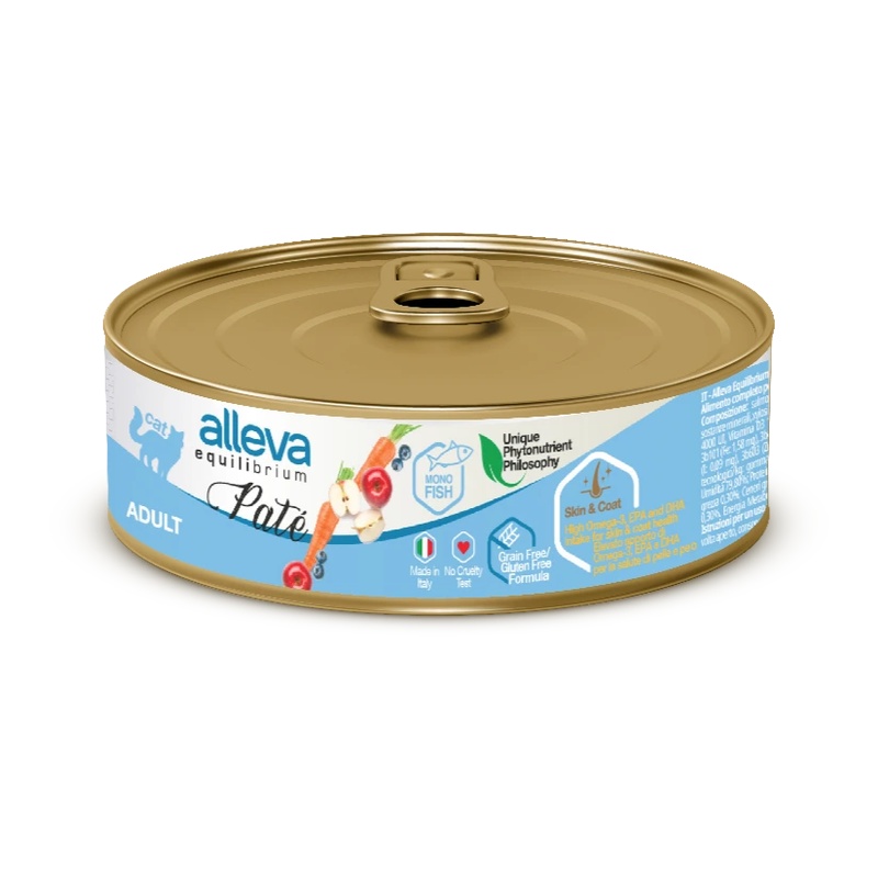 Alleva Equilibrium Salmon Paté je vysoce kvalitní kompletní mokré krmivo pro zajištění každodenní pohody dospělých koček. Chutná receptura založená na lososu jako jediném zdroji živočišných bílkovin (monoprotein) je ideální i pro kočky s alergií nebo potravinovou intolerancí. Přírodní fytonutrienty z jablek, mrkve a borůvek pomáhají udržovat optimální nutriční rovnováhu. Absence obilovin (grain-free) a škrobů pomáhá podporovat trávení a omega-3 mastné kyseliny zdraví kůže a lesk srsti.