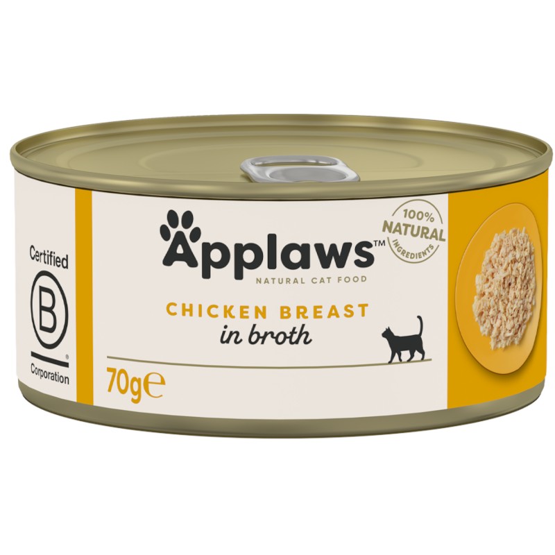 Konzerva Applaws je lehce stravitelné, nutričně vysoce hodnotné, přirozeně bezlepkové, hypoalergenní a hlavně velmi chutné krmení! 100% přírodní krmivo bez umělých konzervačních látek, barviv nebo dochucovadel. Kvalitu poznáte na první pohled po otevření konzervy: přirozená konzistence trhaného masa z kuřecích prsou v lahodném kuřecím vývaru vás přesvědčí a vaši kočku nadchne. Maso pochází z kuřat, která jsou chována ve volných výbězích, krmena přirozeně bez použití hormonů a antibiotik, jsou zdravá a v potravinářské kvalitě.