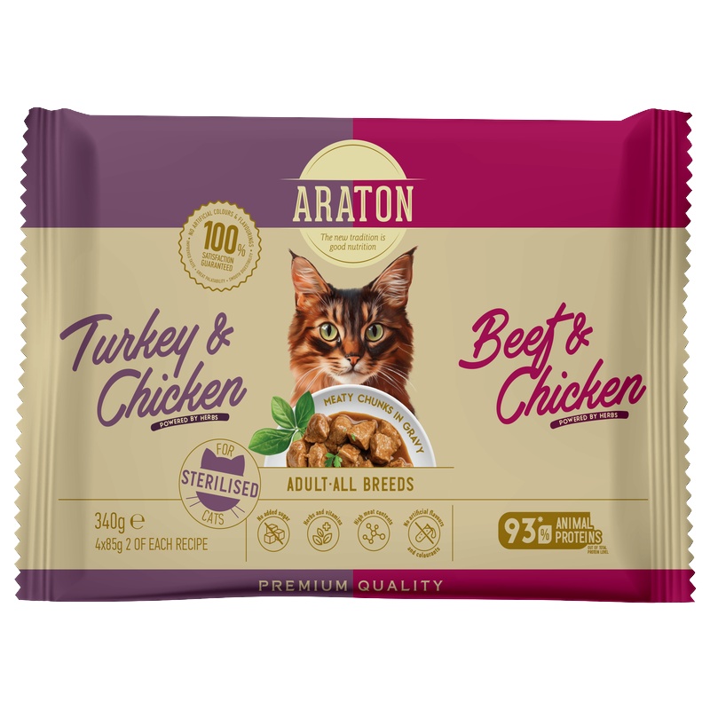 Kompletní vlhké krmivo Araton s krůtím a kuřecím masem a s hovězím a kuřecím masem tvoří chuťově vyvážený set dvou receptur vyvinutý speciálně pro kastrované kočky, které ocení pestrost a zároveň potřebují udržet rovnováhu ve výživě. Po kastraci má organismus tendenci ukládat tuk a chuť k jídlu se zvyšuje. Tento set pomáhá udržovat optimální tělesnou kondici bez stresu a bez kompromisů v chuti.