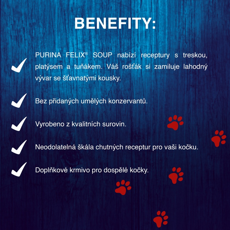 Felix Soup Original je chutná polévka ve formě lahodného vývaru se šťavnatými kousky. Kapsičku stačí nalít do misky a kočka dostane ideální svačinku pro dodání energie i tolik potřebných tekutin. Bez obsahu barviv a umělých konzervantů.