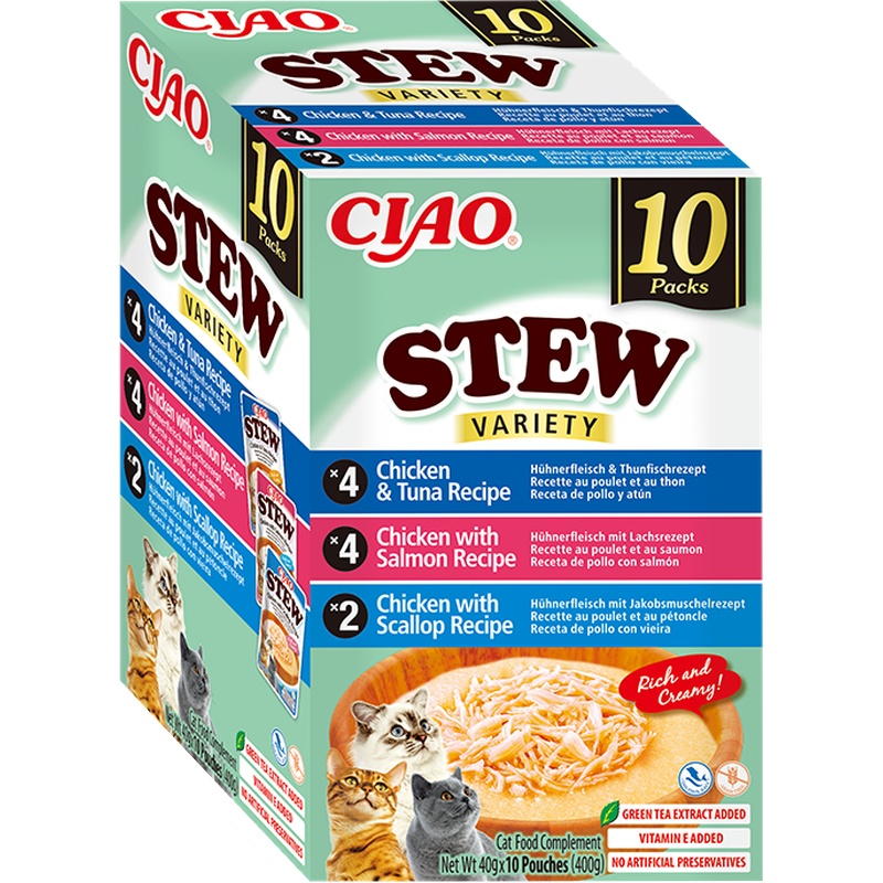 Multipack Ciao Stew obsahuje 10 kapsiček s trhaným kuřecím masem v lahodném krémovém vývaru z mořských škeblí nebo z tuňáka. Vaše kočka bude nadšená jejich lákavým aroma a neodolatelnou chutí. Pečlivě vybrané suroviny, přísně kontrolovaná čerstvost a vysoký obsah vody prospívají celkovému zdraví koček. Krmivo má nízký obsah kalorií a neobsahuje obiloviny, umělá barviva ani konzervanty.