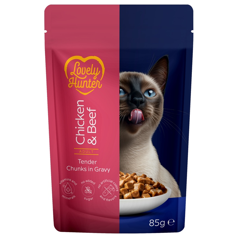 Vlhké krmivo Lovely Hunter s kuřecím a hovězím masem je ideálním každodenním řešením pro dospělé kočky – spojuje lahodnou chuť, kvalitní bílkoviny a důležité živiny.