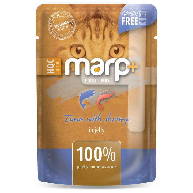 Tuňáka s celými krevetami v želé – žádné vnitřnosti, žádné umělé doplňkové látky, žádné obiloviny – to přinášejí kapsičky Marp Holistic Plus pro kočky a koťata. Doplňkové vlhké krmivo Marp Holistic Plus respektuje výživové potřeby kočky coby výlučného masožravce, a proto obsahuje 100 % bílkovin ze živočišných zdrojů.