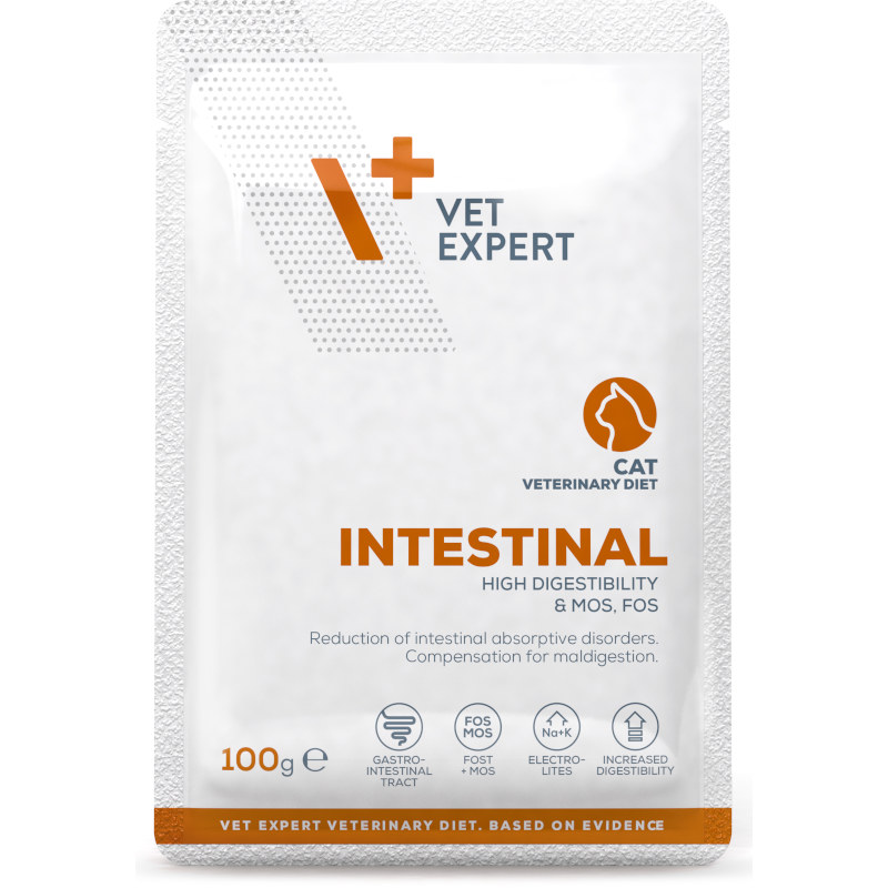 VetExpert VD 4T Intestinal Cat mokré je kompletní dietní krmivo pro dospělé kočky a koťata, které podporuje trávení a absorpci živin při gastrointestinálních potížích nebo exokrinní pankreatické nedostatečnosti. Obsahuje snadno stravitelné živočišné proteiny z kuřecího a hovězího masa, prebiotika FOS a MOS, a zvýšené množství elektrolytů.