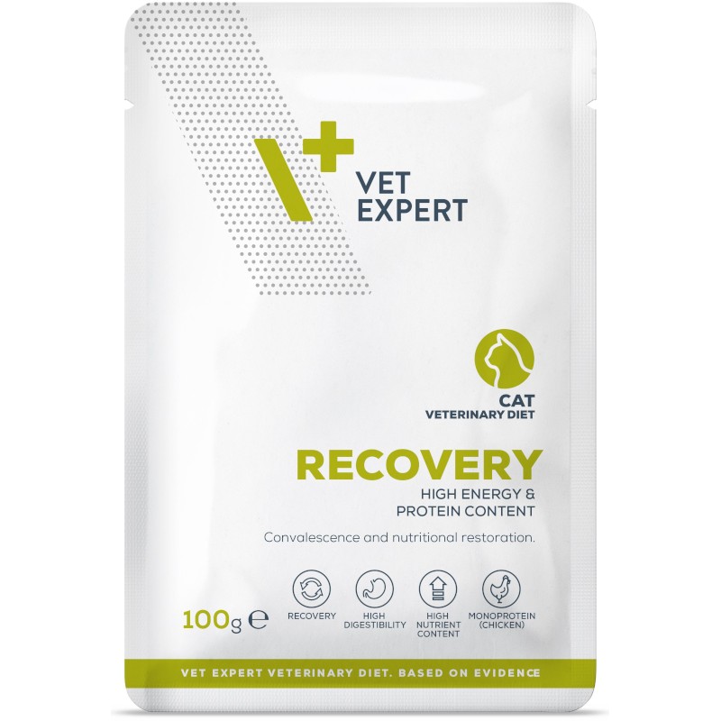 VetExpert VD 4T Recovery Cat mokré je kompletní dietní krmivo pro dospělé kočky určené k nutriční regeneraci a během období rekonvalescence. Nabízí vysokou energetickou hodnotu, kvalitní kuřecí bílkoviny a přidaná prebiotika pro podporu trávení a imunity.