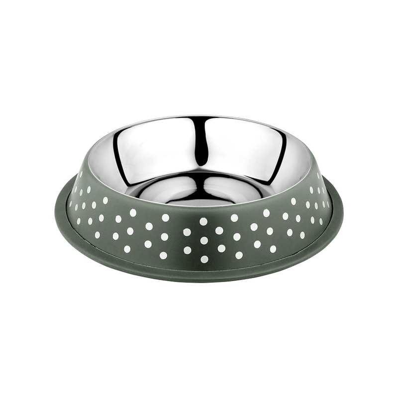 Miska Duvoplus Deco Fix na krmivo nebo vodu pro kočky a malé psy je vyrobena z broušené nerezové oceli. Spodní okraj má gumový lem, aby miska na podlaze neklouzala a nedělala hluk. Stylový vzhled jí dodává moderní potisk s puntíky. Vhodná pouze pro ruční mytí.