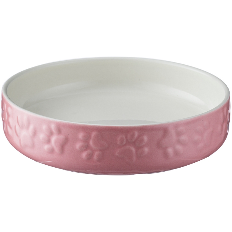 Miska pro kočky má zjednodušený moderní vzhled. Obsahuje vyražené tlapky a je vyrobená z kameniny, je odolná a praktická.