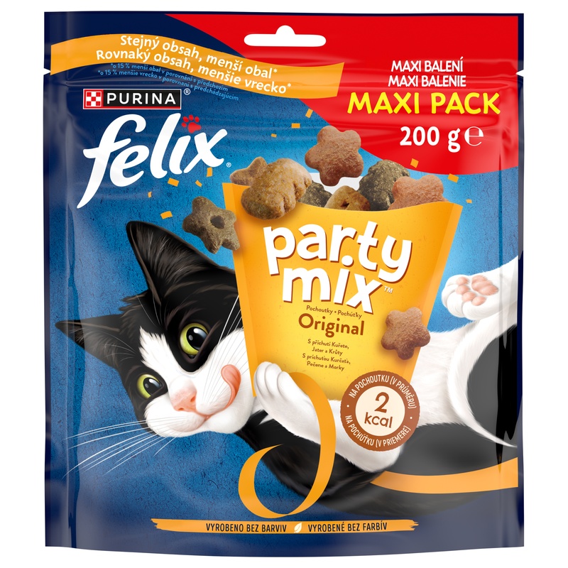 Felix Party Mix Original je neodolatelný mix pochoutek plný lákavých vůní, lahodných příchutí a atraktivních tvarů. Pamlsky obsahují bílkoviny, vitamíny a omega-6 mastné kyseliny pro zdravější a veselejší život vaší kočky.