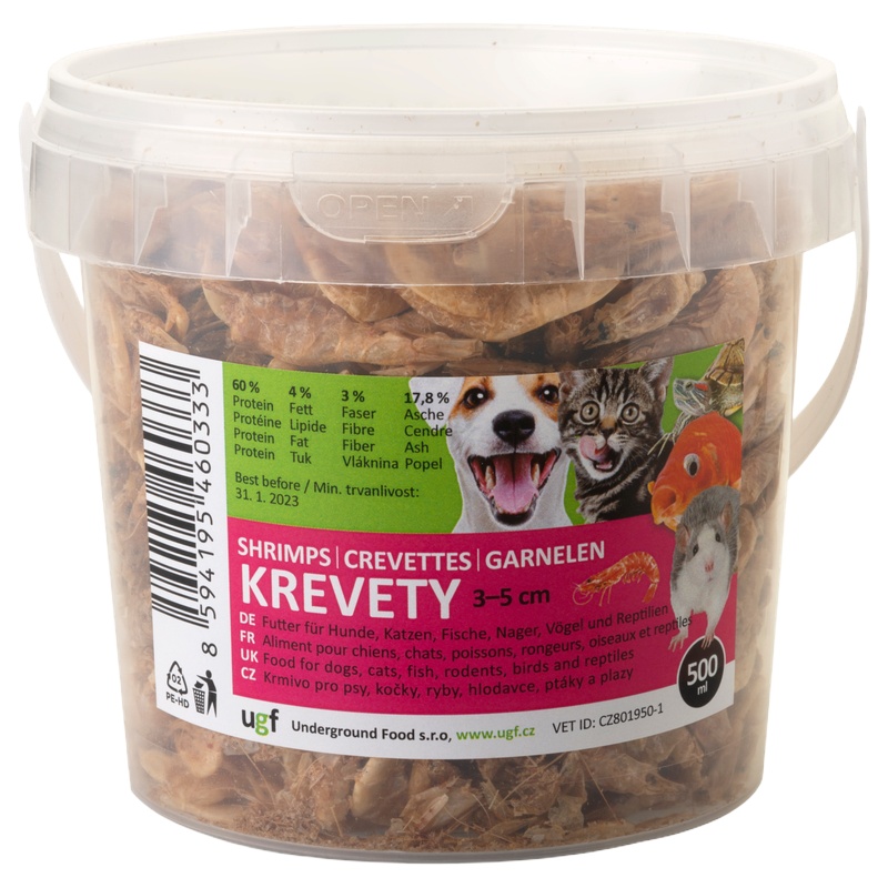 Sušené krevety o velikosti 3–5 cm jsou čistě přírodní doplňkové krmivo určené pro psy, kočky, plazy, ryby (zejména koi kapry), ptáky a hlodavce. Jde o produkt s vysokým obsahem vysoce kvalitního a lehce stravitelného proteinu (60 %), omega-3 nenasycených mastných kyselin, vápníku a vitamínů. Ve výživě psů a koček jsou vhodné jako pamlsek, doplněk běžné potravy zvířat, ale také jako součást potravy při krmení syrovou stravou BARF. Krevety mohou hrát ve výživě psů a koček významnou roli jako doplňující zdroj širokého spektra vysoce stravitelných živin (minerálů, vitamínů, antioxidantů, aminokyselin a mastných kyselin). Podporují imunitní systém, kloubní systém, zdraví kůže a kvalitu srsti. Krevety jsou také velmi oblíbené u mořských a suchozemských želv. Ty z nich získávají důležité tuky, které jim v běžné potravě často chybí.
