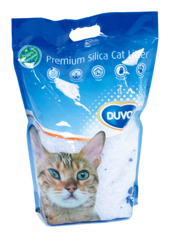 100% přírodní silikagelová podestýlka DUVO+ PREMIUM SILICA CAT LITTER do kočičích záchodků.