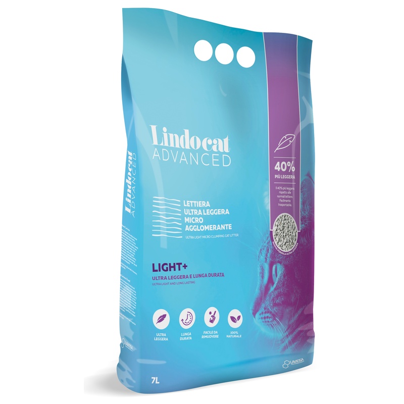 Lindocat Advanced Light+ je hrudkující neprašné stelivo vyrobené ze 100% přírodního bílého bentonitu s malými zrny a nízkou hmotností = váží o 40 % méně než běžná bentonitová steliva. Přitom si zachovává skvělou hrudkující schopnost. Hrudky se vybírají s minimálními ztrátami steliva a podestýlka je díky tomu šetrnější k životnímu prostředí (snižuje množství odpadu) a vydrží déle. Složení bez parfemace je ideální pro kočky s citlivým čichem.