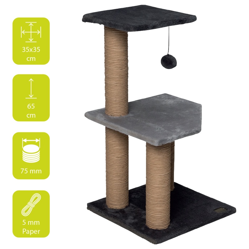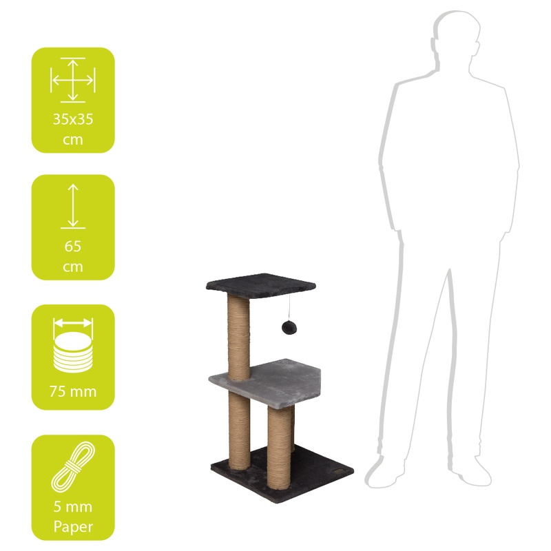 Jednoduché škrabadlo Ebi Hemlock poskytne kočce prostor pro škrábání, zábavu i odpočinek. Sloupky ovinuté sisalovým lanem skvěle uspokojují potřebu koček škrábat. Základna a obě plošiny jsou pro větší pohodlí potažené plyšem. Díky zavěšenému plyšovému míčku může kočka využít škrabadlo i ke hraní.