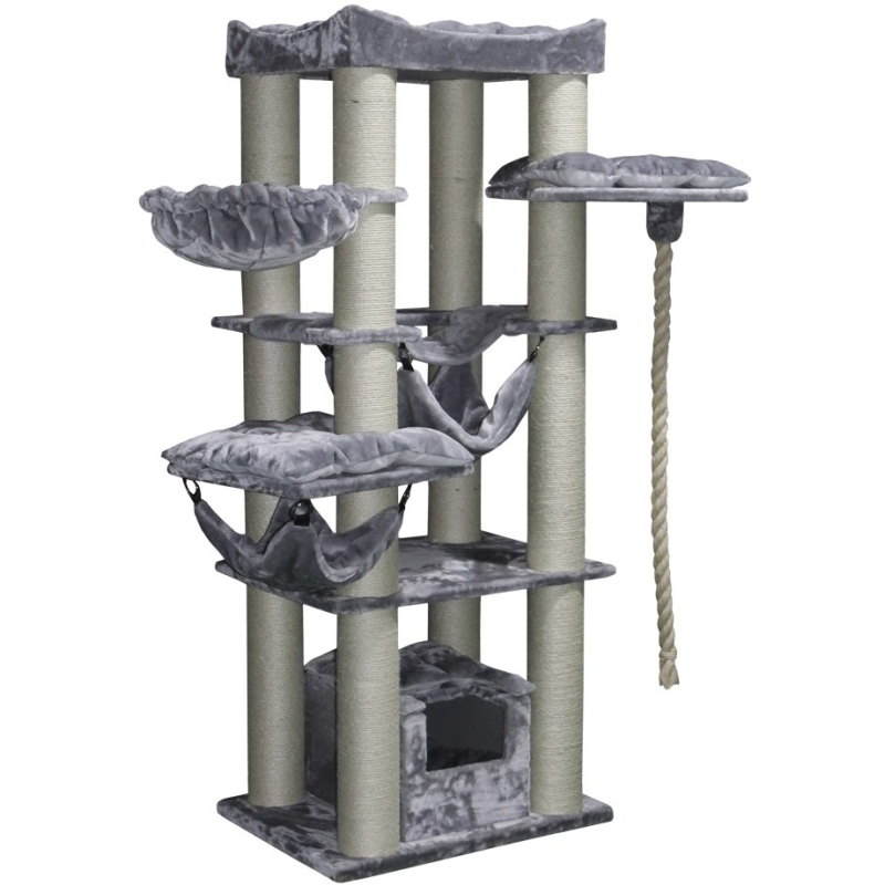 Velké škrabadlo „Rubi“ nabízí Vaší kočce místo pro lezení, ale i místo odpočinku díky mnohým možnostem ležení. Stojí na základu o velikosti 60 x 80 cm a je vysoké 197 cm. Sloupy na škrábání jsou vyrobené ze sisalu a jsou mimořádně široké Ø 15 cm, a proto jsou velmi stabilní. Škrabadlo je vybaveno otevřenou kukaní, dvěma houpacíma sítěmi, závěsným polštářkem a mnohými dalšími ležícími plochami. Je také vybavený lanem dlouhým 1,2 m, které je stimuluje hraní.