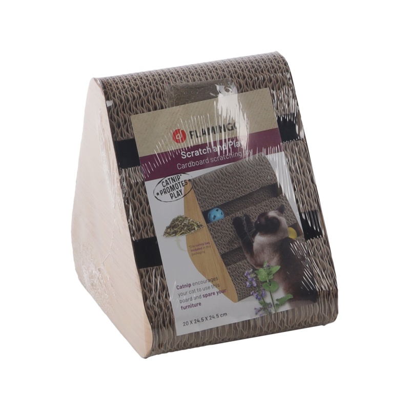 Papírové škrabadlo Flamingo Beli pro kočky je vyrobeno z kvalitního recyklovatelného vlnitého kartonu. Škrabací plochy jsou ze tří stran, takže škrabadlo vydrží déle. Součástí balení je sáček s catnipem (šantou kočičí), kterým lze škrabadlo posypat, aby bylo pro kočku ještě přitažlivější. Pro větší zábavu jsou ve škrabadle dvě skuliny s cinkající kuličkou.