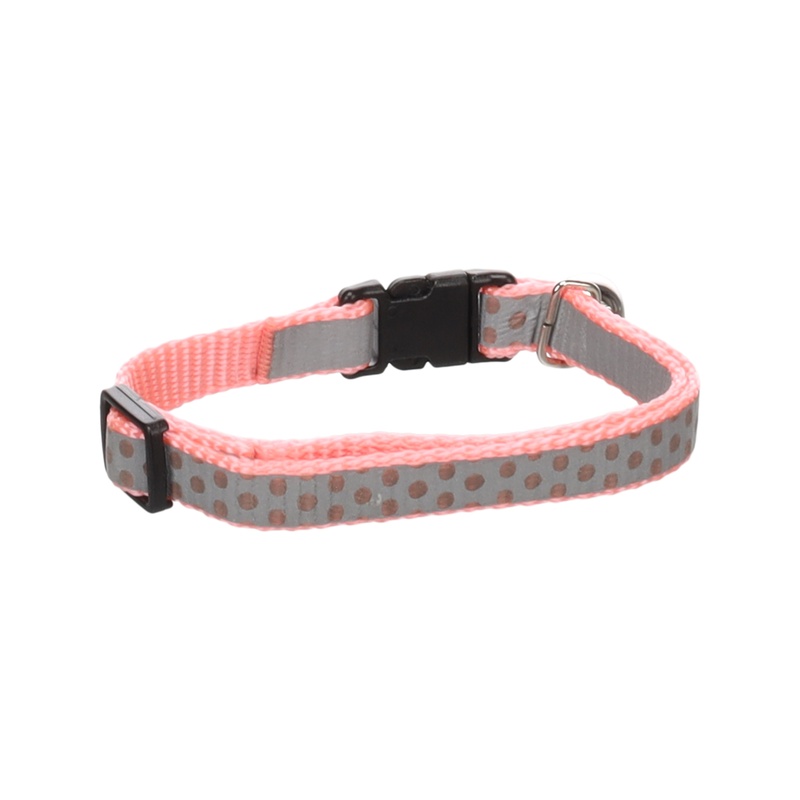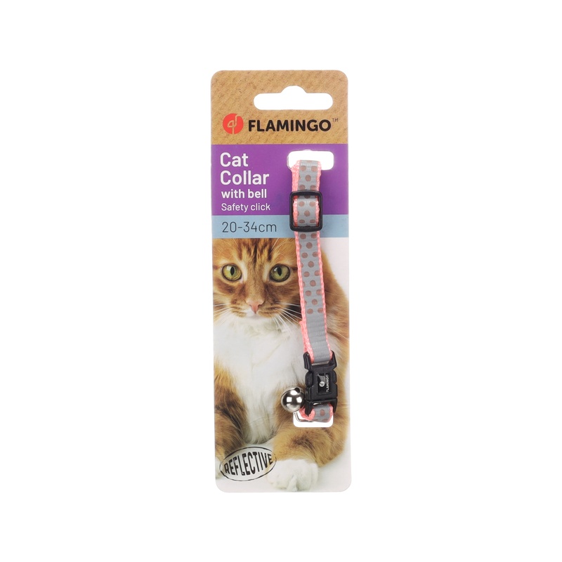 Obojek z odolného nylonu má po celé délce široký reflexní pás, který zvyšuje bezpečí kočky za snížené viditelnosti. Zapíná se na plastovou přezku s bezpečnostním zámkem. Délku lze nastavit v rozsahu 20–34 cm. K obojku je připnutá rolnička, která při pohybu jemně zvoní a varuje tak potenciální kořist.