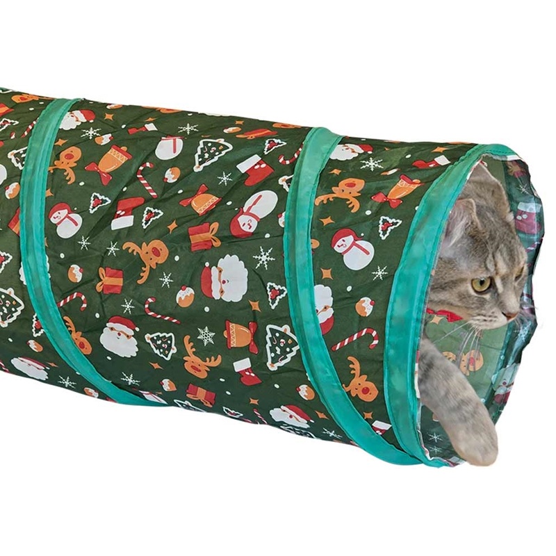 Textilní tunel s vánočními motivy je ideální dárek pod stromeček pro hravé a zvídavé kočky. Je vyrobený z odolného nylonu a při pohybu šustí, čímž povzbuzuje přirozenou zvědavost a hravost koček. Uvnitř tunelu je navíc zavěšená hračka ve tvaru stromečku.