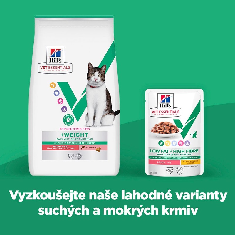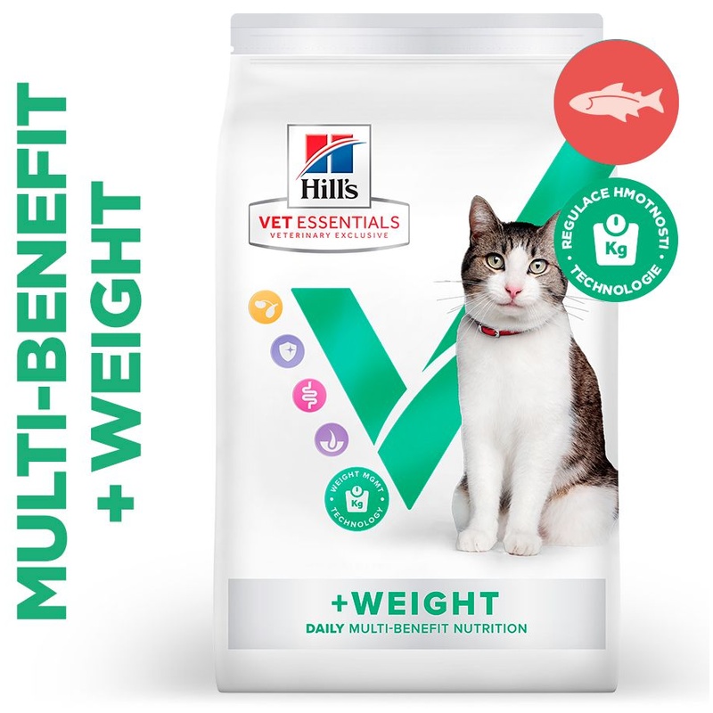 Kompletní krmivo Hill's Vet Essentials Multi-Benefit +WEIGHT s lososem je určené pro mladší dospělé kočky po kastraci. Složení pomáhá kočce udržovat optimální hmotnost díky unikátní směsi ingrediencí, která prokazatelně podporuje spalování tuků. Granule podporují zdraví životně důležitých orgánů včetně močového systému. Díky technologii S+OXSHIELD receptura podporuje takové prostředí v močovém ústrojí, které snižuje riziko vzniku struvitových a kalcium oxalátových kamenů.