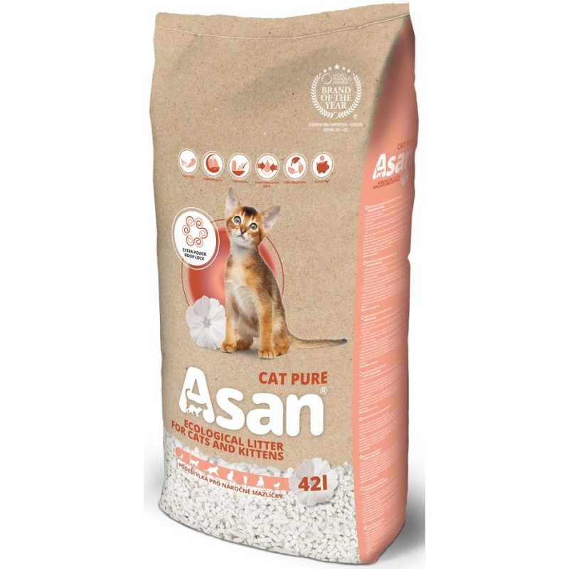 Asan Cat Pure je ekologická podestýlka pro krátkosrsté kočky a fretky s technologií absorpce pachů LAPUR. Nehrudkující stelivo je vhodné pro kočky s tradičními hygienickými návyky. Efektivně absorbuje pachy a prodlužuje tak životnost steliva v toaletě. Stelivo neobsahuje silice, parfémy a přidaná barviva.