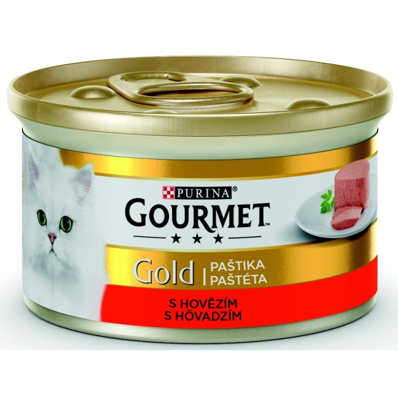GOURMET Gold jemná paštika s hovězím svádí Vaši kočku jemnou sametovou chutí.