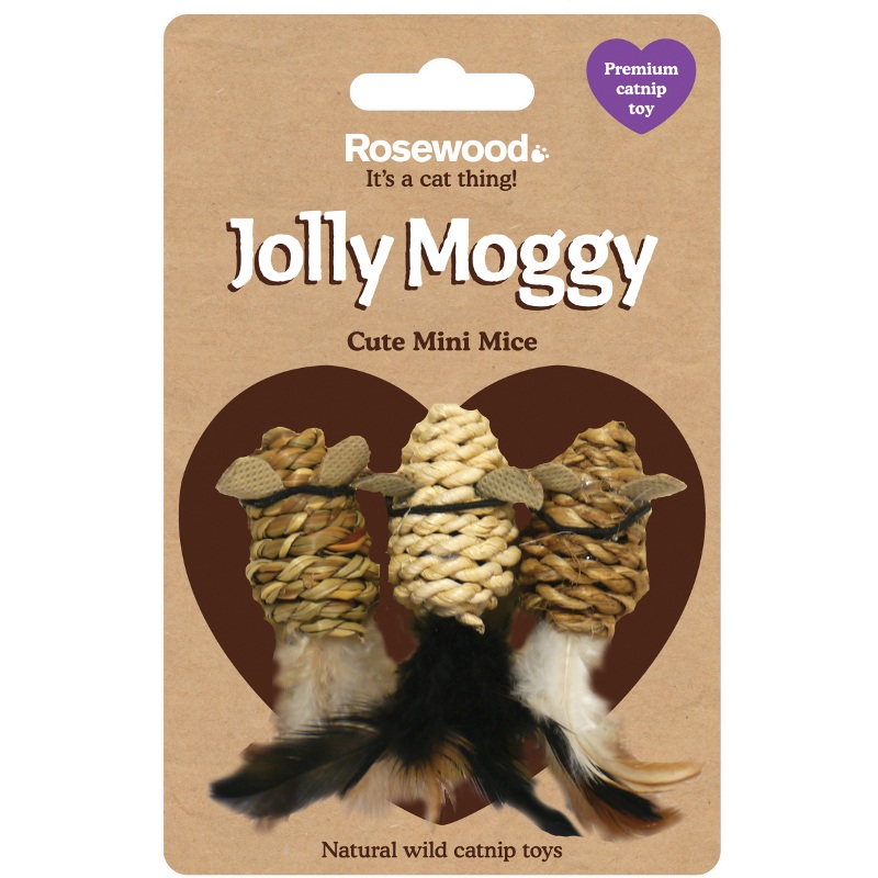 Myšky z ratanu s péřovými ocásky, naplněné šantou kočičí.