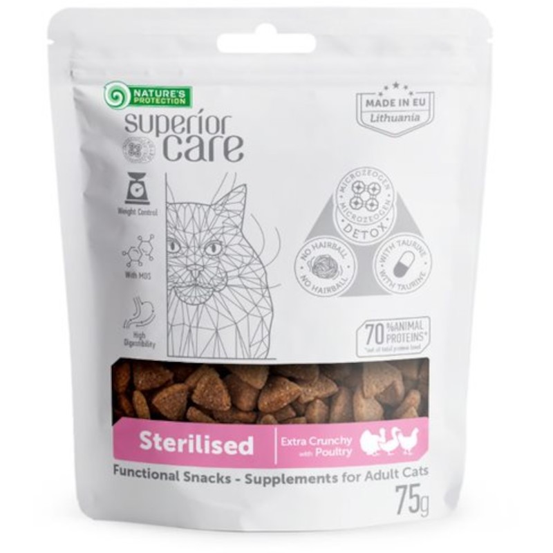 Tento doplněk stravy přispívá ke kontrole hmotnosti a podpoře celkové zdravotní kondice dospělých sterilizovaných koček. Hlavním zdrojem bílkovin je vysoce stravitelné drůbeží maso, skvělé pro posílení svalů a tkání. Mořské řasy jsou přírodním zdrojem vitamínů A, C, K a B6, vápníku, draslíku, mědi, jódu a manganu a podporují proces odstraňování zubního plaku a kamene. Pamlsky jsou obohaceny taurinem, který je znám svým pozitivním vlivem na zdraví srdce. Přírodní minerální složka MicroZeoGen (dynamicky mikronizovaný klinoptilolit) posiluje imunitní systém a ochranné funkce organismu. Speciálně tvarované pamlsky jsou chutné a extra křupavé, takže si kočičí mazlíčci jejich žvýkáním očistí plak ze zubů a osvěží dech.