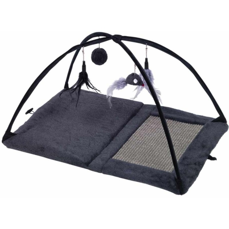 Kočičí hřiště s obloukovou konstrukcí, na níž jsou zavěšeny čtyři hračky s peříčky, chrastítky a rolničkami. Základová deska hřiště potažená jemným plyšem je skládací, jedna polovina slouží jako masážní zóna a nabízí intenzivní zážitek z drbání srsti. Hrací kulička zavěšená na konstrukci je naplněná catnipem.