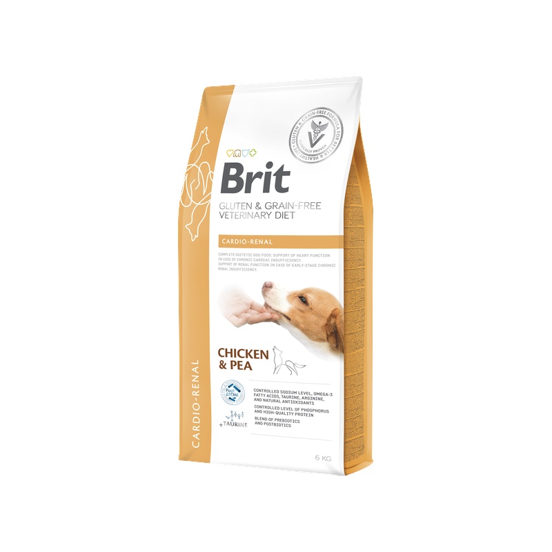 Brit Gluten & Grain-Free Veterinary Diet Cardio Renal je speciálně formulované veterinární krmivo určené pro psy trpící chronickým srdečním nebo ledvinovým onemocněním. Granule obsahují střední množství vysoce kvalitních bílkovin a nízký obsah fosforu, který napomáhá zpomalit progresi chronického onemocnění ledvin. Nízký obsah sodíku přispívá ke snížení zadržování tekutin a odlehčení srdečnímu svalstvu.
