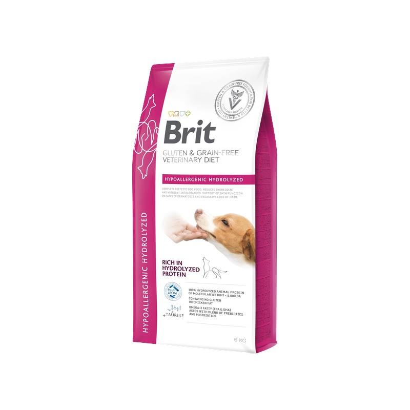 Brit Gluten & Grain-Free Veterinary Diet Hypoallergenic Hydrolyzed je kompletní dietní krmivo bez obilovin určené pro psy trpící potravinovými alergiemi, intolerancí a kožními potížemi, jako jsou dermatózy či nadměrné vypadávání srsti. Granule obsahují 100% hydrolyzovaný živočišný protein s nízkou molekulovou hmotností (< 5 000 Da), který minimalizuje riziko alergických reakcí a zajišťuje vynikající stravitelnost.