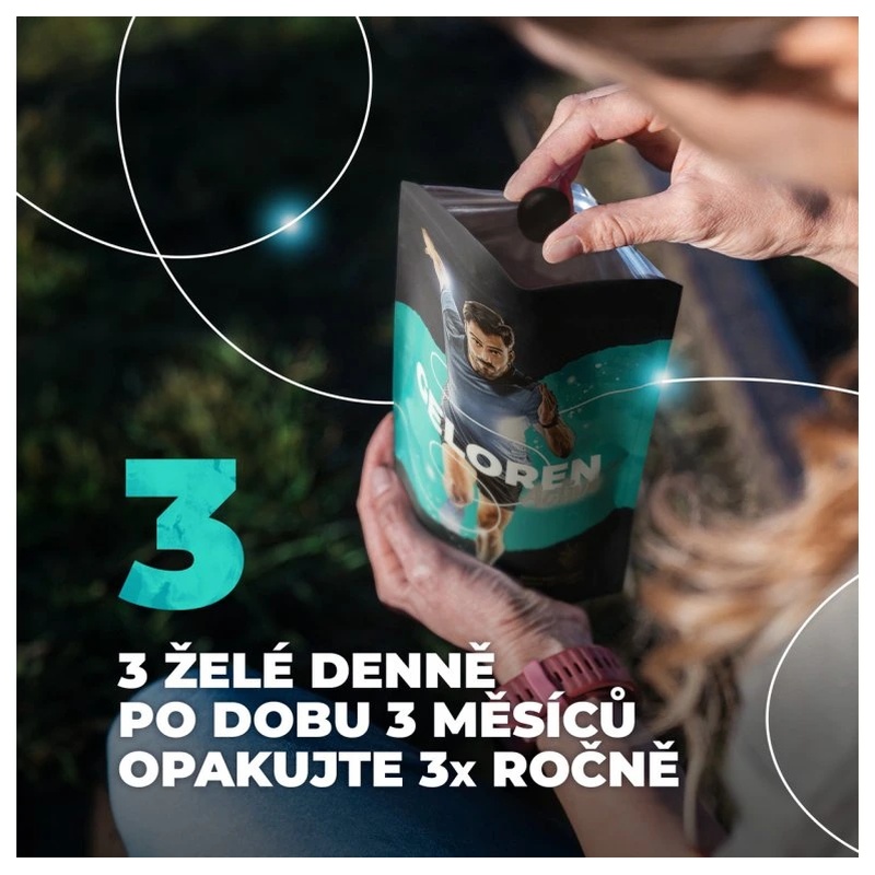 Geloren Active s příchutí ostružiny je určený pro osoby s vyšším zatížením kloubů a pro seniory. Obsahuje vysoké množství kyseliny hyaluronové, porcinního chondroitin sulfátu, hydrolyzovaného kolagenu, želatiny a vitamínu C, který přispívá k tvorbě kolagenu nezbytného pro normální funkci kostí a chrupavek. Želatinová forma se snadno konzumuje a má příjemnou chuť.