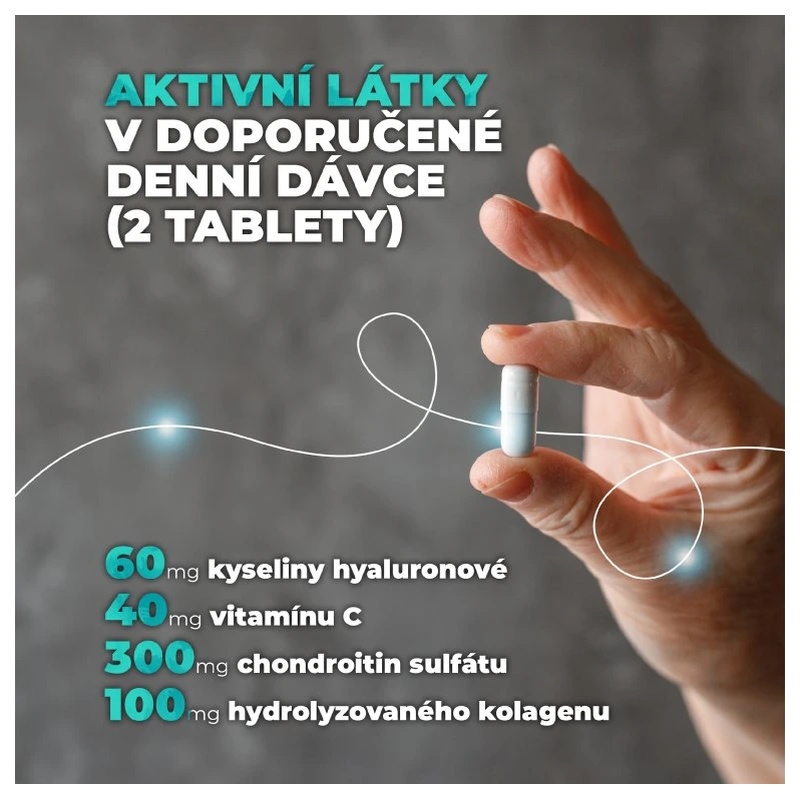 kyselina hyaluronová (60 mg) – součást mezibuněčné hmoty; ve zvýšené míře se nachází právě v kloubech.