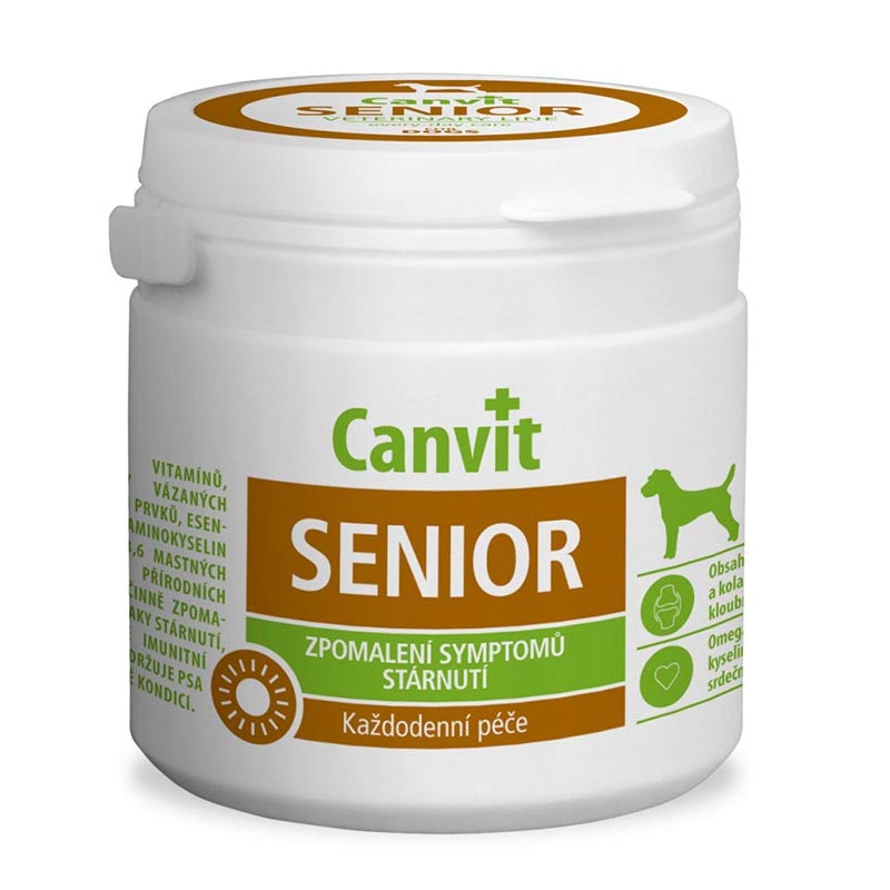 Canvit Senior je komplex vitaminů organicky vázaných stopových prvků, esenciálních aminokyselin a omega 3,6 mastných kyselin z přírodních zdrojů. Účinně zpomaluje příznaky stárnutí, podporuje imunitní systém a udržuje psa ve výborné kondici. Vhodné pro stárnoucí psy, psy nad 7 let věku.