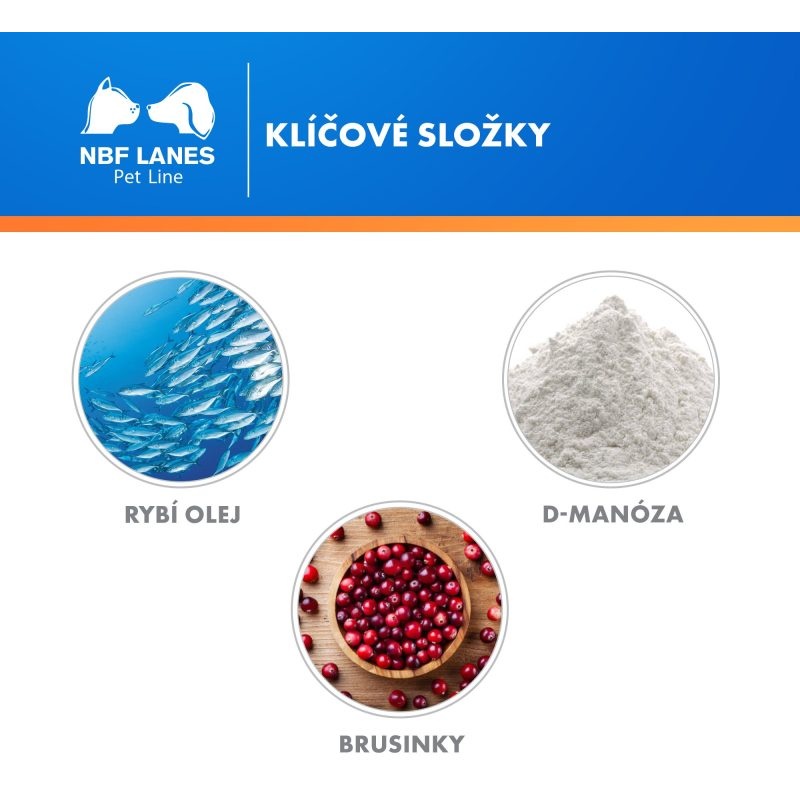 rostlinné oleje a tuky (rafinovaný slunečnicový olej), rybí olej (35 % EPA, 25 % DHA) 8,57 %, extrakty z bylin (brusinka – Vaccinium macrocarpon aiton – sušený prášek z ovocné šťávy) 8,57 %, D-manóza 8,57 %, hydrolyzované bílkoviny živočišného původu (drůbežího původu), glukosamin (chitosamin) získaný fermentací 2,85 %, fruktooligosacharidy (FOS) 2,28 %, kvasinky (pivovarské kvasnice), extrakty z bylin (lespedézie – Lespedeza capitata Michx. – prášek z listů 1,4 %, orthosiphon –Orthosiphon stamineus Benth. – prášek z listů 1,4 %), krilový olej 1 %, Lactobacillus reuteri NBF DC PRO* 0,57 %, rostlinné oleje a tuky (hydrogenovaný palmový olej), extrakty z bylin (grifonie – Griffonia simplicifolia – prášek ze semen 0,28 %, myrha – Commiphora myrrha Nees. Engl. – oleoresinový prášek 0,14 %), oleje a rostlinné tuky (řepkový olej), maltodextrin.