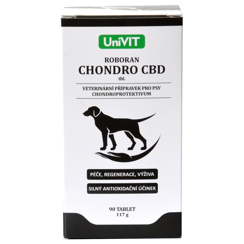 Veterinární přípravek Roboran Chondro CBD slouží pro podporu a regeneraci kloubní chrupavky a k výživě kloubů a zlepšení jejich pohyblivosti. Chondroprotektivum je vhodné pro všechny váhové kategorie dospělých psů. Díky vysoce účinné kombinaci látek lze použit jako doplněk stravy při problémech pohybového aparátu i pro snížení rizika výskytu problémů u sportovních a pracovních psů.