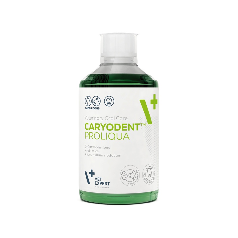 Tekutý přídavek Caryodent Proliqua do pitné vody ve formě koncentrátu obsahuje β-karyofylen pro udržení ústní sliznice a dásní psů a koček v optimálním stavu. Složení přípravku je doplněno o hnědou řasu (Ascophyllum nodosum) a extrakt z granátového jablka, jejichž vlastnosti brání usazování biofilmu a tvorbě zubního kamene, čímž zabraňují vzniku nepříjemných pachů. Prebiotika navíc pomáhají udržovat ústní mikrobiom v rovnováze.