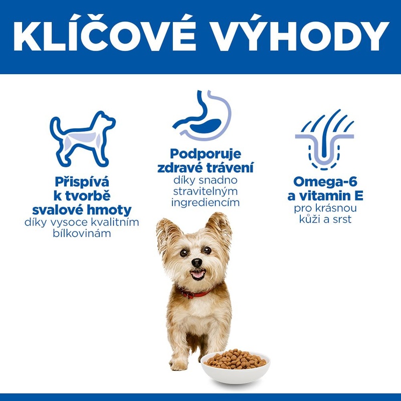 Kompletní krmivo Hill's Science Plan Adult Small & Mini s kuřetem určené pro dospělé psy malých a mini plemen představuje lahodnou a vyváženou výživu, která splňuje jedinečné energetické potřeby malých psů. Omega-6 mastné kyseliny a vitamín E prospívají zdraví kůže a srsti. Granule obsahují snadno stravitelné ingredience a vysoce kvalitní bílkoviny pro podporu tvorbu a udržení svalové hmoty. Patentovaná směs prebiotik ActivBiome+ vyživuje střevní mikrobiom a tím podporuje trávení a celkovou pohodu vašeho mazlíčka.