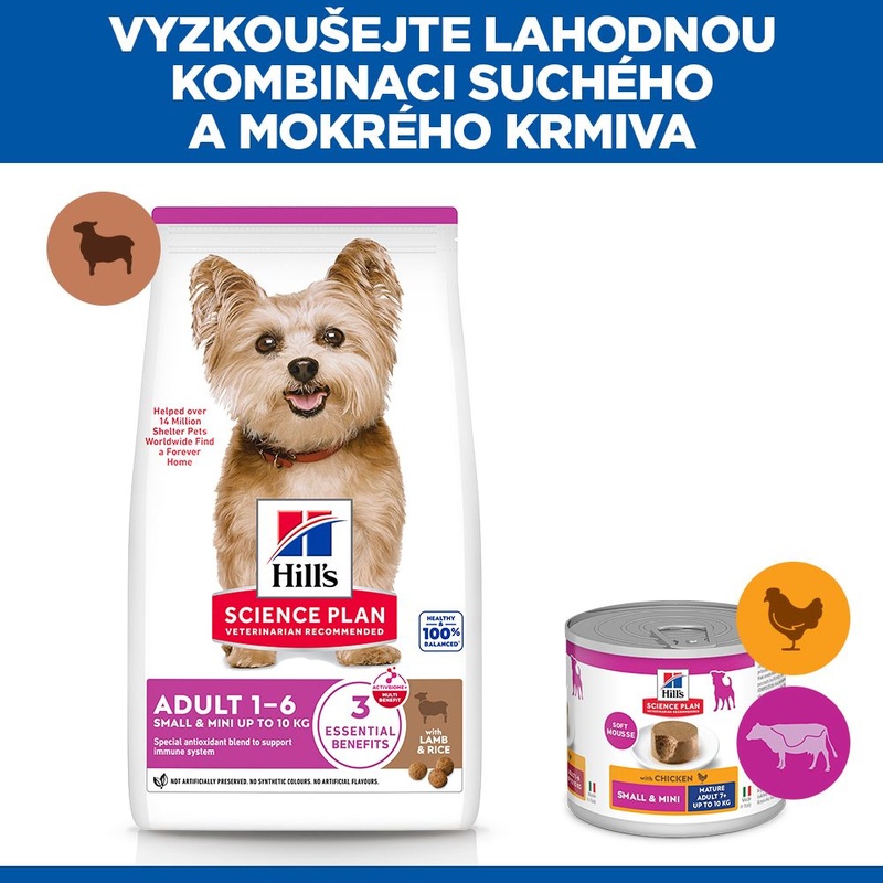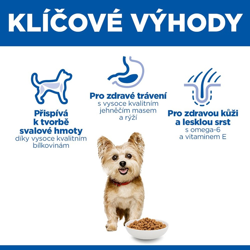 Kompletní krmivo Hill's Science Plan Adult Small & Mini s jehněčím a rýží určené pro dospělé psy malých a mini plemen představuje lahodnou a vyváženou výživu, která splňuje jedinečné energetické potřeby malých psů. Omega-6 mastné kyseliny a vitamín E prospívají zdraví kůže a srsti. Granule obsahují snadno stravitelné ingredience a vysoce kvalitní bílkoviny pro podporu tvorby a udržení svalové hmoty. Krmivo s patentovanou směsí prebiotik ActivBiome+ vyživuje střevní mikrobiom a tím podporuje trávení a celkovou pohodu vašeho mazlíčka.