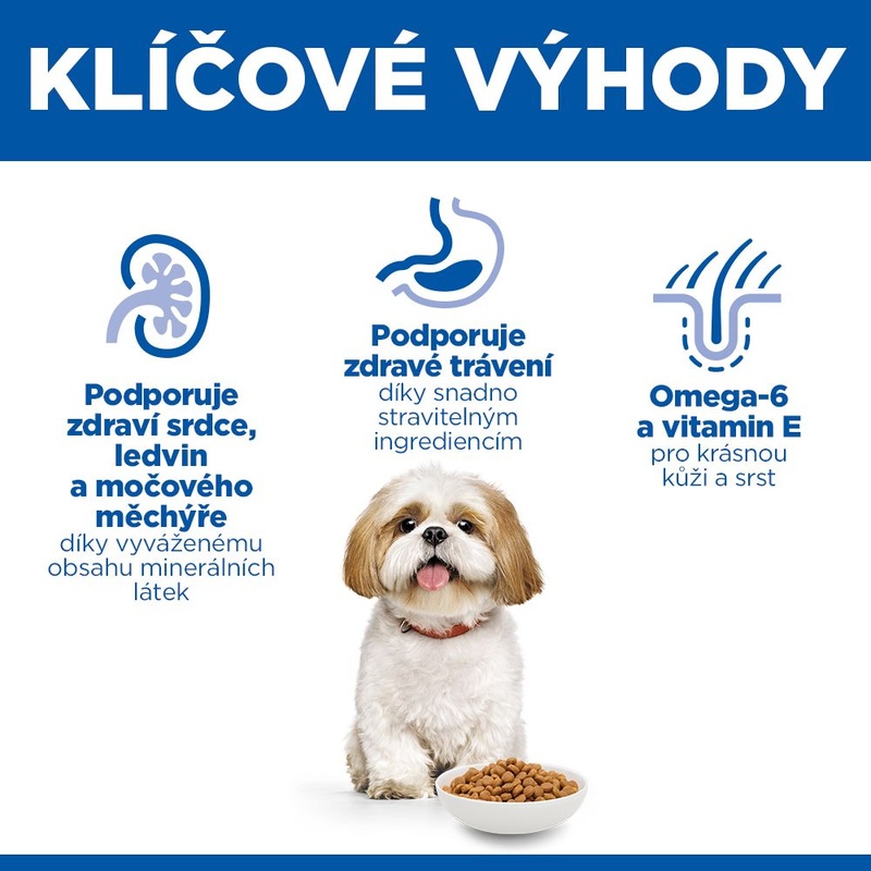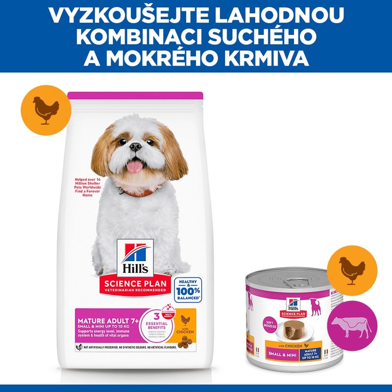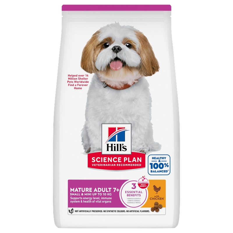 Kompletní krmivo Hill's Science Plan Mature Adult 7+ Small & Mini s kuřetem určené pro psy malých a mini plemen od 7 let věku představuje lahodnou a vyváženou výživu, která splňuje jedinečné energetické potřeby starších malých psů. Omega-6 mastné kyseliny a vitamín E prospívají zdraví kůže a srsti. Granule obsahují vyvážené minerály pro zdraví srdce, ledvin a močového měchýře a snadno stravitelné ingredience pro hladké trávení. Krmivo s patentovanou směsí prebiotik ActivBiome+ vyživuje střevní mikrobiom a tím podporuje trávení a celkovou pohodu vašeho mazlíčka.