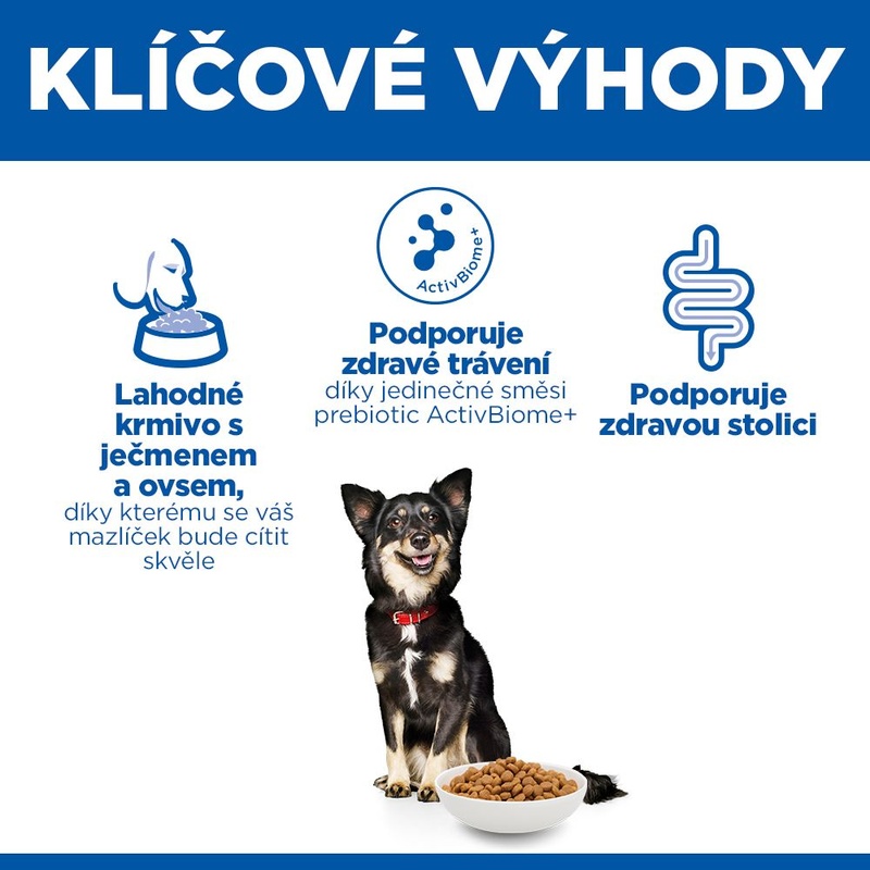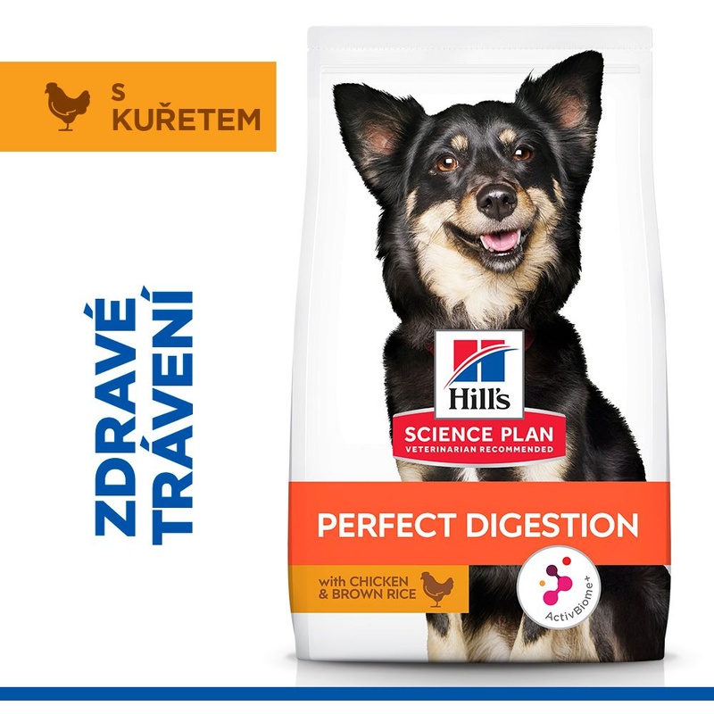 Krmivo Hill's Science Plan Perfect Digestion s kuřetem a hnědou rýží pro dospělé psy malých a mini plemen podporuje optimální trávení a zdraví střevního mikrobiomu. Jedinečná směs prebiotik ActivBiome+ pomáhá vyživovat a udržovat v rovnováze střevní mikrobiom vašeho mazlíčka a podporuje pravidelnou a zdravou stolici. Granule s obsahem ovsa a ječmene poskytují vyváženou výživu pro celkové zdraví psa.