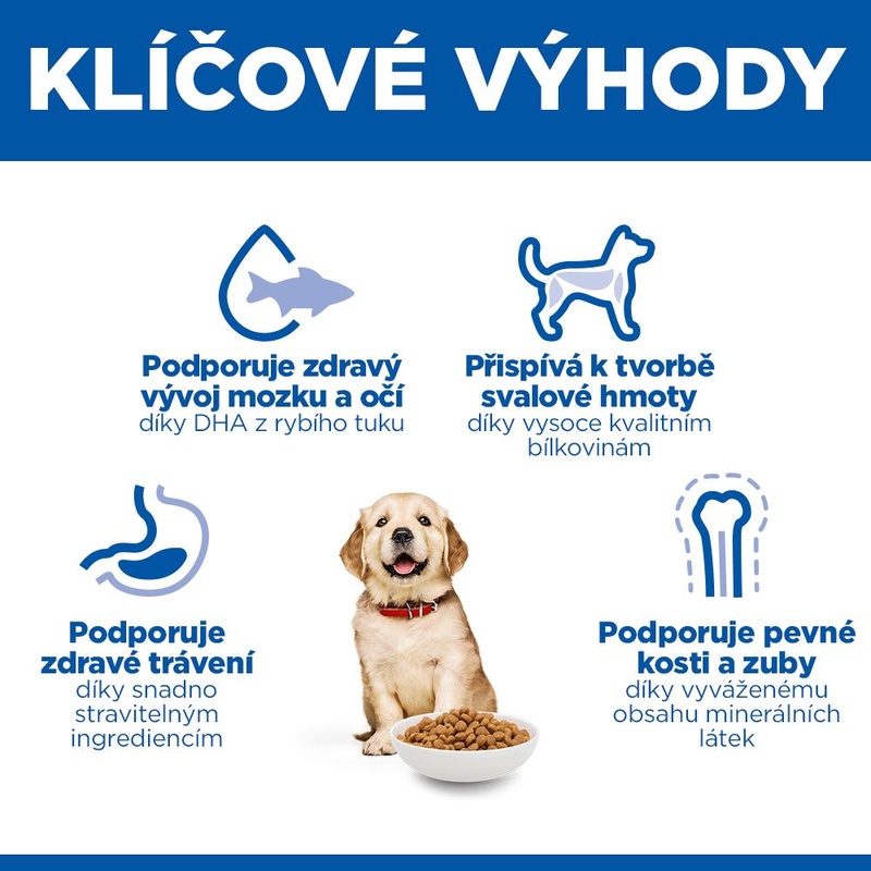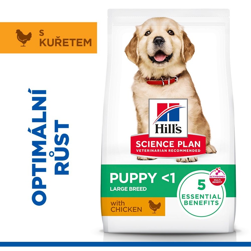 Hill's Science Plan Puppy Large je krmivo s kuřetem pro štěňata velkých plemen a představuje lahodnou, zdravou a vyváženou výživu s optimálním obsahem vápníku pro kontrolovaný růst kostí psích mláďat. Granule obsahují omega-3 mastnou kyselinu DHA z rybího oleje pro zdravý vývoj mozku a očí, vysoce kvalitní bílkoviny pro tvorbu svalové hmoty a vyváženou směs minerálních látek pro silné zuby a kosti. Patentovaná směs prebiotik ActivBiome+ Multi-Benefit vyživuje střevní mikrobiom, čímž podporuje zdravé trávení i celkovou pohodu vašeho mazlíčka.